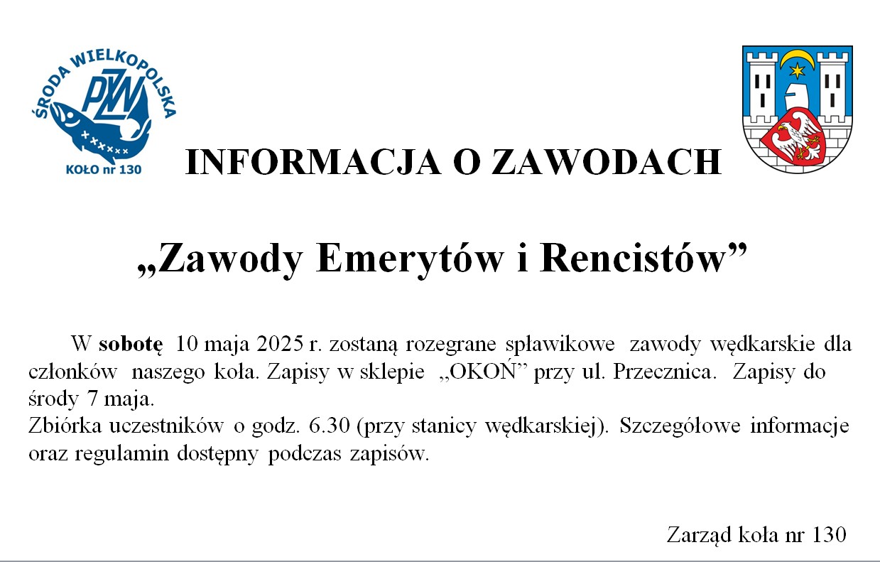 W sobotę 10 maja odbyły się spławikowe zawody wędkarskie dla Emerytów i Rencistów średzkiego koła. W zawodach wystartowało 17 zawodników.